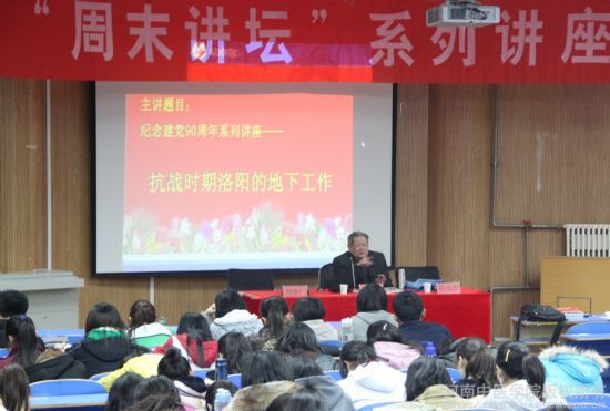 3月24日下午3时,我校庆祝建党九十周年系列报告会首场报告在新校区一楼多功能厅开讲。我校离休老干部徐学智同志应邀为广大师生作了《抗战时期洛阳的地下工作》报告。报告会由团委书记刘金厂主持。