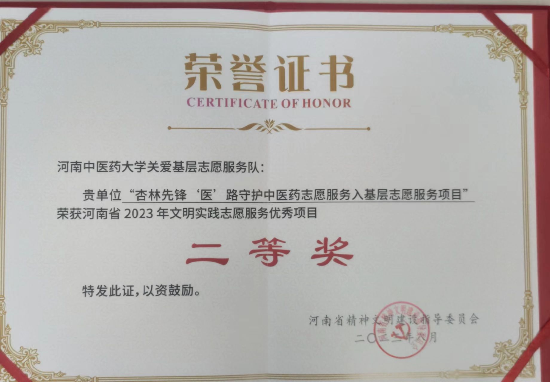 经河南省文明办组织初评、复评,从全省18个地市推荐上报的250个项目中评出60个项目,于2023年7月14日至15日在河南师范大学进行现场展示交流。我校《杏林先锋 “医”路守护——中医药志愿服务深入基层项目》荣获展示大赛二等奖。校工会组织宣传部部长刘欲晓、本草书院辅导员沈雪慧参加展示交流活动。