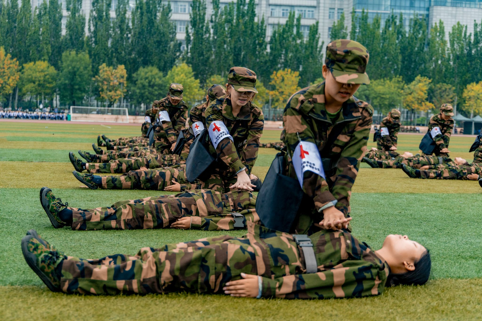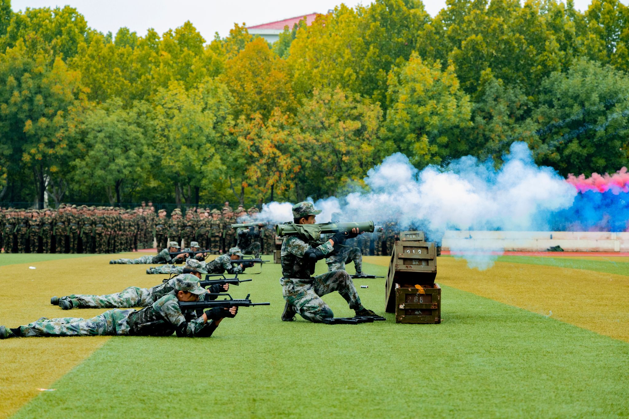 典礼在庄严雄壮的国歌声中正式拉开帷幕。随着校党委书记李小芳教授发布军训汇报表演指令,16个分列式方阵依次走过主席台前接受检阅,同学们步履坚定、口号嘹亮、气势恢弘,尽展河中医学子的飒爽英姿。展演中,军体拳、擒敌拳、匕首操、战术演练等9个节目依次呈现,新生同学和教官们目光炯炯有神,动作铿锵有力,呐喊势破重霄,一招一式尽显21天军训的丰厚成果,一令一动折射出河中医学子奋发有为的青春风采和报效祖国的坚定信念。
