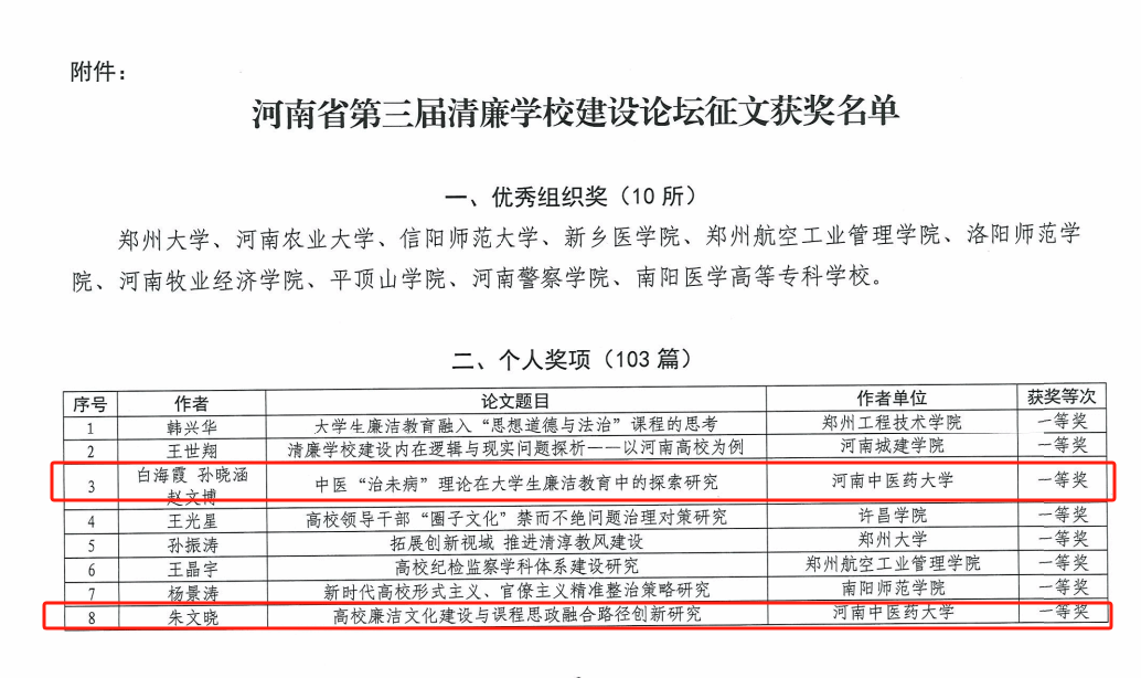 本网讯(文/图 王雨佳)近日,河南省第三届清廉学校建设论坛暨高校廉政研究机构负责人会议在郑州举办,清廉学校建设论坛征文评选结果揭晓,我校外语学院朱文晓老师的《高校廉洁文化建设与课程思政融合路径创新研究》、校纪委监察办公室白海霞老师的《中医“治未病”理论在大学生廉洁教育中的探索研究》两篇论文获得一等奖,两位获奖作者同时在河南省第三届清廉学校建设论坛上作交流发言。本届论坛共征集论文487篇,评选出了一等奖15篇,二等奖35篇,三等奖53篇。